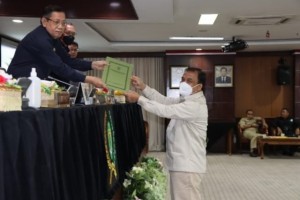 Foto : Wakil Ketua Pansus Pembahas Penyelenggara Ketenagalistrikan Bagus Susetyo saat menyerahkan laporan akhir kerja pansus kepada pimpinan DPRD Kaltim, Selasa 10 Mei 2022.