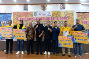 Penyerahan Bonus dilakukan secara simbolis oleh Wakil Bupati Kutai Timur Kasmidi Bulang, didampingi oleh Kadispora Kutim Basrie dan ketua KONI Kutim Rudi Hartono.