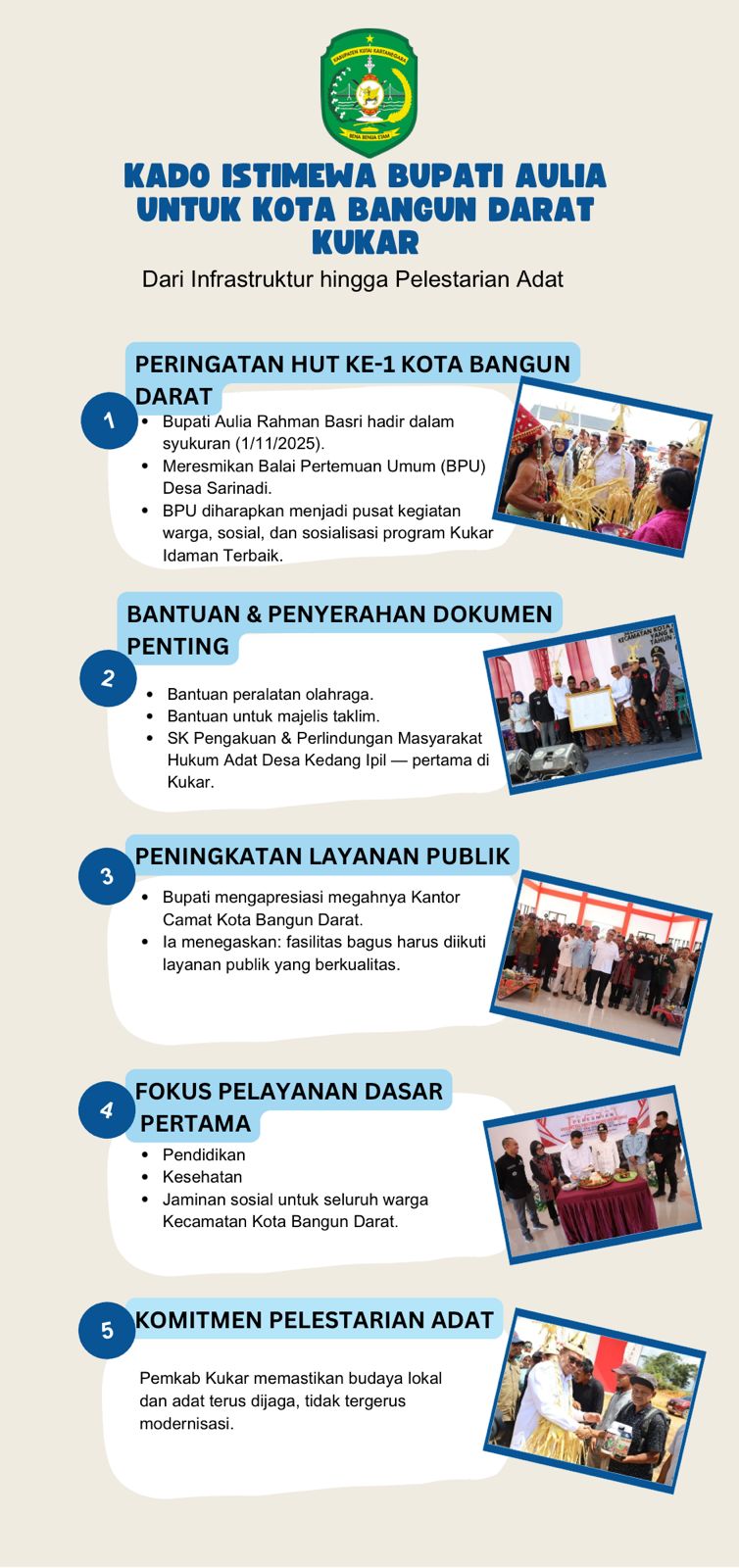 Usai peresmian, Aulia menuju Kantor Camat untuk mengikuti syukuran hari jadi Kecamatan Kota Bangun Darat. Acara dibuka dengan penyerahan berbagai bantuan, seperti bantuan pertanian, fasilitas olahraga, bantuan habsyi untuk majelis taklim, serta penyerahan Surat Keputusan tentang Pengakuan dan Perlindungan Masyarakat Hukum Adat Desa Kedang Ipil. Kegiatan kemudian dilanjutkan dengan pemotongan tumpeng sebagai bentuk syukur.