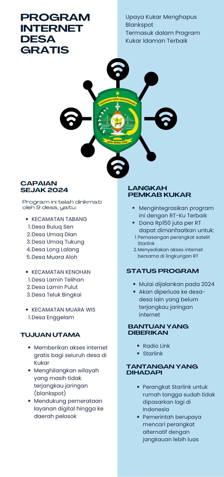 KUTAI KARTANEGARA – Pemerintah Kabupaten (Pemkab) Kutai Kartanegara (Kukar) terus mempercepat realisasi Program Internet Desa Gratis sebagai komitmen menghadirkan akses internet merata hingga ke seluruh desa. Langkah ini menjadi bagian penting dari program prioritas Kukar Idaman Terbaik.