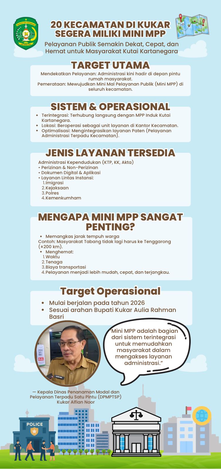 Melalui rencana pembangunan Mini Mal Pelayanan Publik (Mini MPP) di seluruh kecamatan, Pemkab Kukar berupaya memastikan bahwa layanan administrasi dapat dijangkau masyarakat tanpa harus keluar dari wilayah tempat tinggal mereka. Langkah ini menjadi bagian penting dari implementasi Kukar Idaman Terbaik, yang digagas Bupati Aulia Rahman Basri.