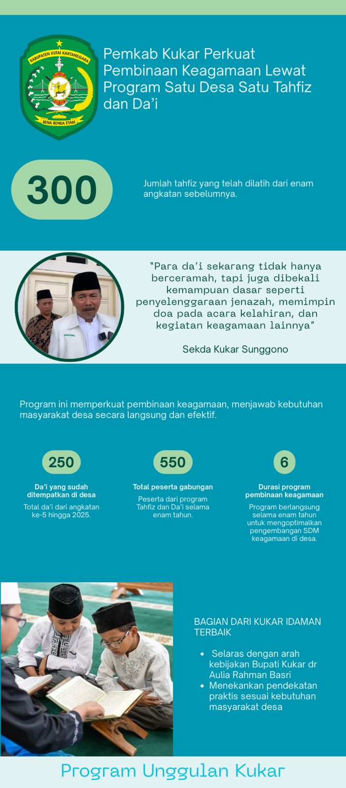 Sekretaris Daerah (Sekda) Kukar, Sunggono, menjelaskan bahwa pelaksanaan program ini kini lebih komprehensif karena tidak hanya berfokus pada penyediaan tahfiz dan da’i, tetapi juga pembentukan SDM keagamaan yang siap terjun melayani masyarakat.