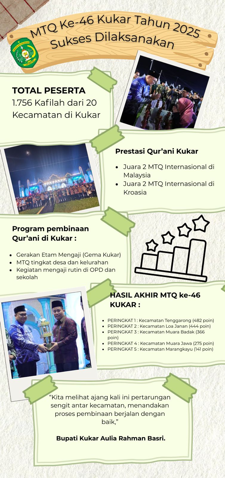 ?Aulia menyampaikan bahwa setelah MTQ ini, Pemkab Kukar akan mempersiapkan diri menghadapi MTQ maupun STQ tingkat Provinsi Kalimantan Timur tahun depan.