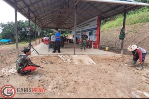 Terlihat Anggota Kodim 0906/Tenggarong dan warga setempat saat melakukan persiapan panggung untuk menyambut Pangdam VI/ Mulawarman